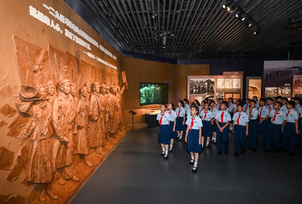 2025年7月7日上午,北京市第十二中學(xué)的少先隊員參觀紀念全民族抗戰(zhàn)爆發(fā)88周年儀式暨《為了民族解放與世界和平》主題展覽。新華社記者 陳曄華 攝