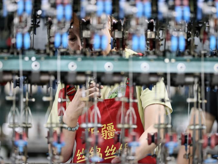 2025年7月29日,工人在新疆絲錦絲綢紡織有限公司生產(chǎn)車(chē)間內(nèi)的自動(dòng)繅絲機(jī)上作業(yè)。近年來(lái),新疆塔城地區(qū)烏蘇市引進(jìn)桑蠶繭絲綢智能化全產(chǎn)業(yè)鏈項(xiàng)目,鼓勵(lì)農(nóng)民種桑養(yǎng)蠶,拓寬興邊富民新“絲”路。