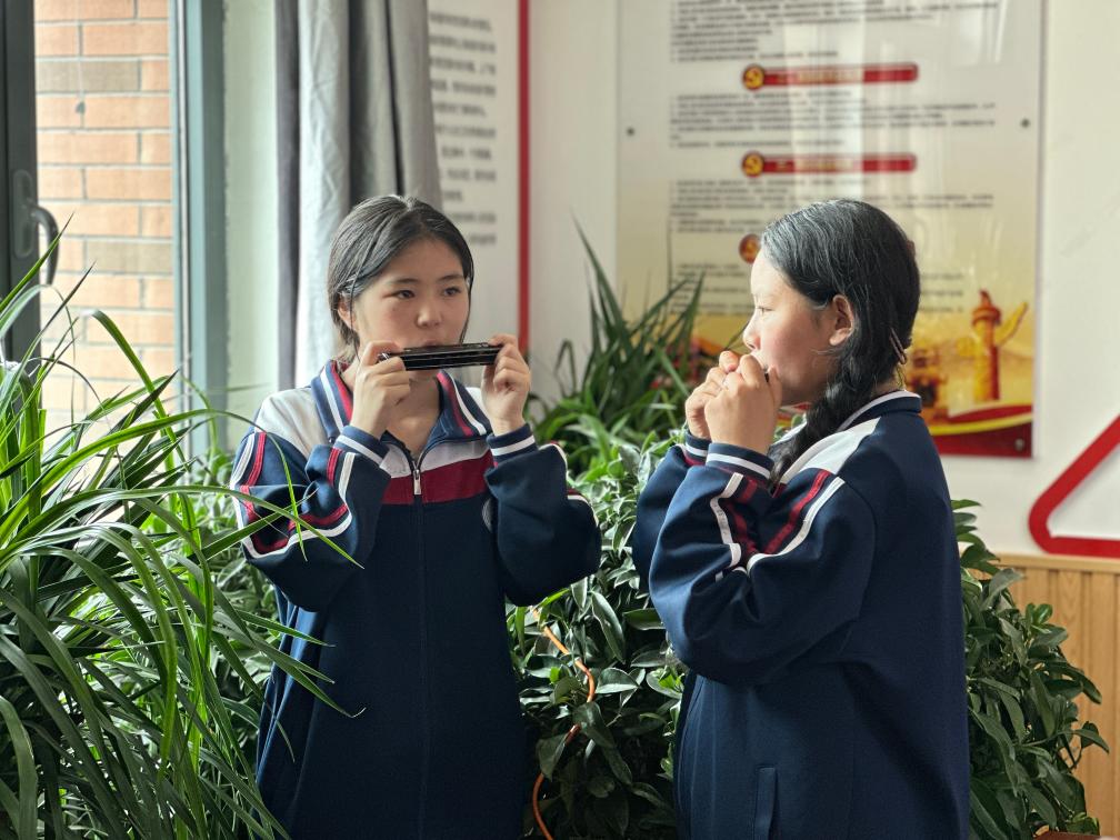 5月30日,果洛西寧民族中學(xué)學(xué)生鬧拉(右)和同學(xué)在練習(xí)口琴吹奏。新華社記者 張子琪 攝