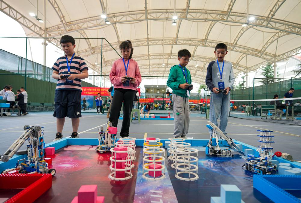 5月31日,四名參賽選手在全國(guó)青少年科技教育成果展示大賽云南省區(qū)域賽上操作機(jī)器人進(jìn)行比賽。新華社記者 陳欣波 攝