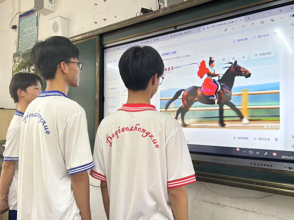 3月3日,廣西容縣容州鎮(zhèn)都嶠中學(xué)學(xué)生觀(guān)看老師使用人工智能大模型生成的海報(bào),感受語(yǔ)文課堂的互動(dòng)創(chuàng)新。(陳春仲 攝)