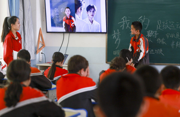 新疆克孜勒蘇柯爾克孜自治州阿圖什市哈拉峻鄉(xiāng)謝依特小學(xué),是一所主要面向柯爾克孜族學(xué)生的村級小學(xué),2022年8月成為該州首個西部計劃志愿者包校支教的試點學(xué)校。23名戍邊支教西部計劃志愿者服務(wù)隊的志愿者,在這所小學(xué)承擔(dān)著教書育人的工作。經(jīng)過近三年的支教服務(wù),學(xué)生的學(xué)習(xí)成績顯著提高,得到當(dāng)?shù)貜V泛認(rèn)可。這是2025年4月23日,支教教師高淑賢(左一)在班級里展示她為學(xué)生們制作的“AI夢想職業(yè)照”。