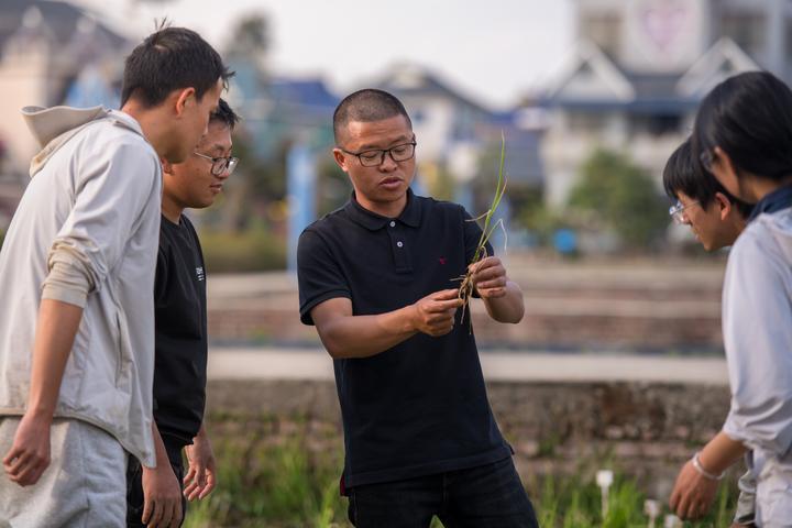 今年37歲的黃光福是云南大學(xué)農(nóng)學(xué)院的一名青年教師,同時也是云南大學(xué)在云南省勐海縣勐遮鎮(zhèn)曼恩村成立的多年生稻科技小院的負責(zé)人。多年來,他帶領(lǐng)學(xué)生扎根田間,進行技術(shù)攻關(guān)。團隊利用長雄野生稻特有的地下莖無性繁殖能力,成功培育出“云大25”“云大107”等新品種,突破性地實現(xiàn)水稻“一次栽種、連續(xù)收割”,讓“割韭菜般收稻子”的農(nóng)業(yè)成果從實驗室走向田間地頭。這是2025年2月27日,青年教師黃光福(中)在試驗田間給學(xué)生授課。