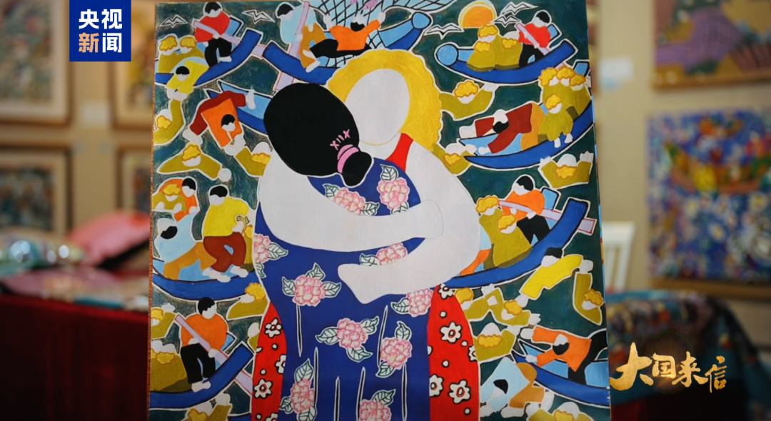 吳小飛也回贈(zèng)了一件禮物。由于她是一名漁民畫(huà)創(chuàng)作者,于是就把一幅名為《擁抱》的作品創(chuàng)作出來(lái)送給了對(duì)方。在她看來(lái),這不但是她們兩個(gè)人的擁抱,也是國(guó)和國(guó)的擁抱。