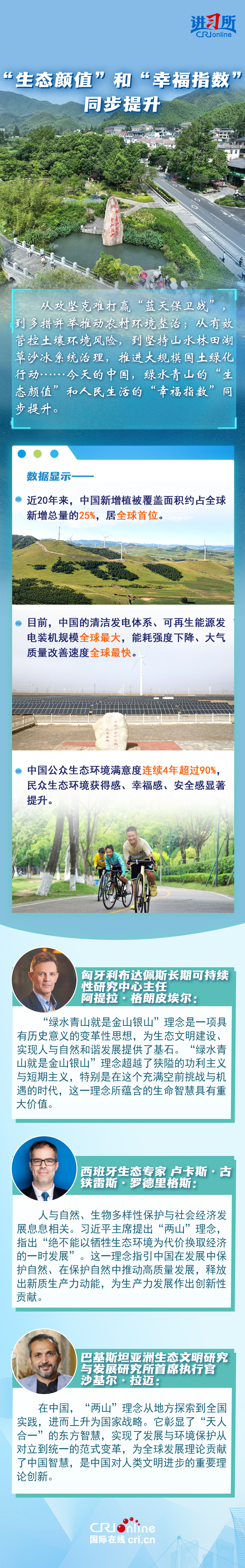 “從歷史長(zhǎng)河來(lái)看,如果說(shuō)我們這一代人能留給后人點(diǎn)什么,我看生態(tài)文明建設(shè)就是很重要的一個(gè)方面。生態(tài)文明建設(shè)最能給老百姓帶來(lái)獲得感,環(huán)境改善了,老百姓體會(huì)也最深。”20年前,時(shí)任中共浙江省委書(shū)記的習(xí)近平在安吉余村考察時(shí),肯定了余村下定決心關(guān)閉礦區(qū)、全面走綠色發(fā)展之路的做法,并首次提出“綠水青山就是金山銀山”重要理念,20年來(lái),這一重要理念帶給中國(guó)大地一場(chǎng)革命性變化,直接推動(dòng)美麗中國(guó)建設(shè)取得歷史性成就。