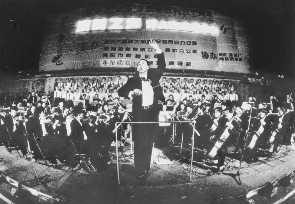 1995年8月15日,在貴陽(yáng)市人民廣場(chǎng)舉行的萬(wàn)人露天交響音樂會(huì)上,演員和萬(wàn)余名市民高唱《義勇軍進(jìn)行曲》。