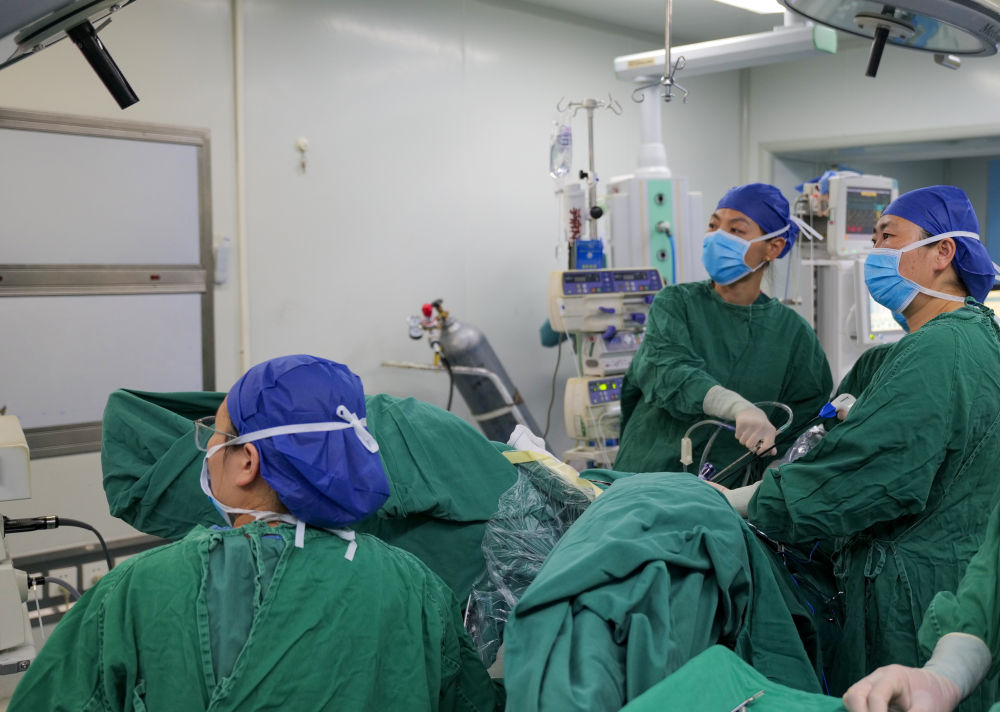 2025年8月4日,北京大學(xué)人民醫(yī)院第十批援藏婦科醫(yī)生張果(中)與西藏自治區(qū)人民醫(yī)院醫(yī)生李芳(左)一起為患者做手術(shù)。新華社發(fā)(柑丹鴦琦 攝)