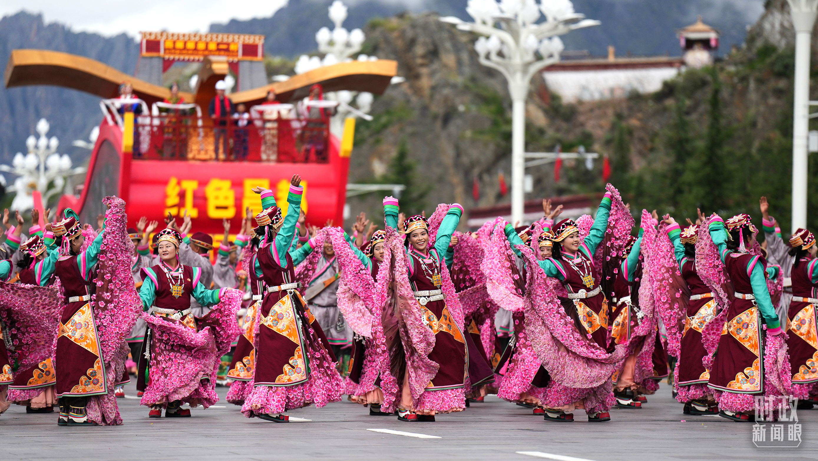 六十載櫛風(fēng)沐雨,一甲子滄海桑田。格桑花海群舞中,悠揚(yáng)的扎念琴聲響起,雄渾的甲諧舞、瓊結(jié)卓舞、弦子舞、鍋莊舞、普蘭宣舞應(yīng)接不暇,舞出西藏繁榮發(fā)展的精氣神。身穿工布服飾、飛天服飾等藏族特有服飾的游行群眾,以一場(chǎng)非物質(zhì)文化遺產(chǎn)的盛宴向西藏自治區(qū)成立60周年獻(xiàn)禮。
