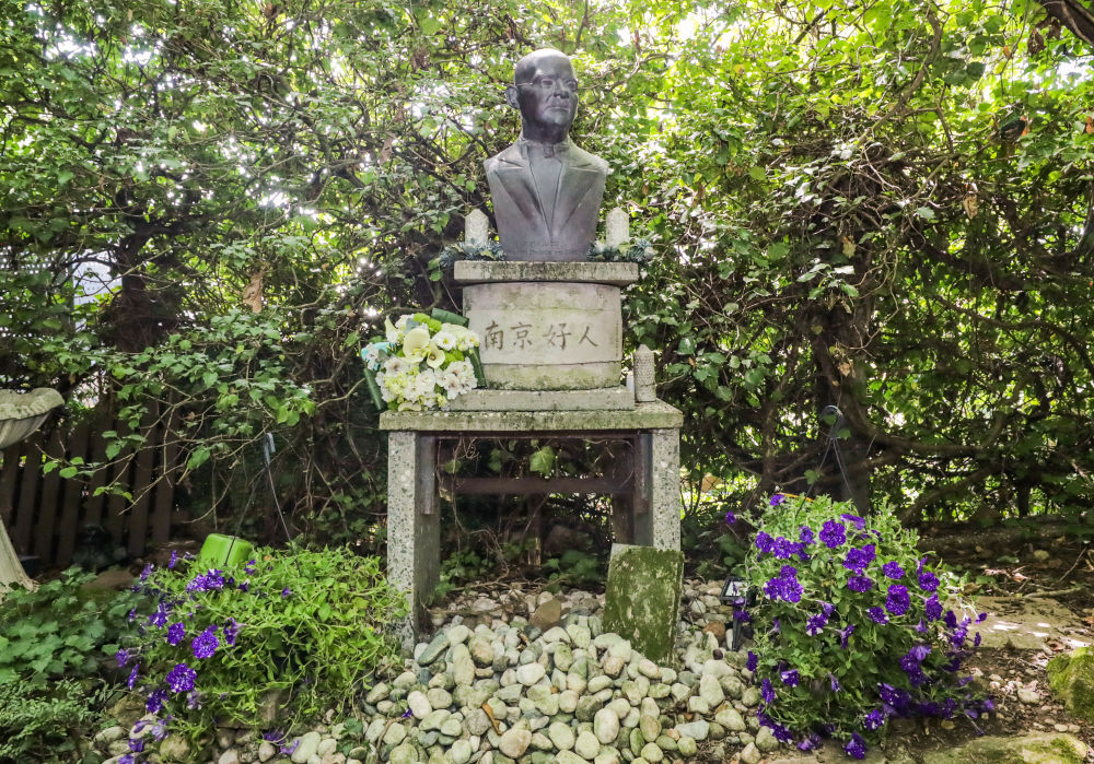 1950年,拉貝逝世,被安葬在柏林西郊。墓碑周圍是從南京移栽而來的竹子、梅花和菊花?;颁佊杏昊ㄊ?。墓碑前方矗立著拉貝半身雕像,其下立有紀(jì)念碑,用中德雙語鐫刻著:“感恩——永遠(yuǎn)銘記拉貝先生的國際人道主義善舉!中國·南京?!蹦骨皵[放著憑吊者送上的簇簇鮮花。