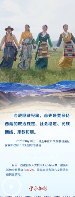 2025年8月20日,習近平總書記率中央代表團乘專機抵達拉薩,出席西藏自治區(qū)成立60周年慶?;顒印T诼犎∥鞑刈灾螀^(qū)黨委和政府工作匯報時,習近平總書記強調(diào),“持續(xù)深入抓好穩(wěn)定、發(fā)展、生態(tài)、強邊四件大事,努力建設團結富裕文明和諧美麗的社會主義現(xiàn)代化新西藏”。