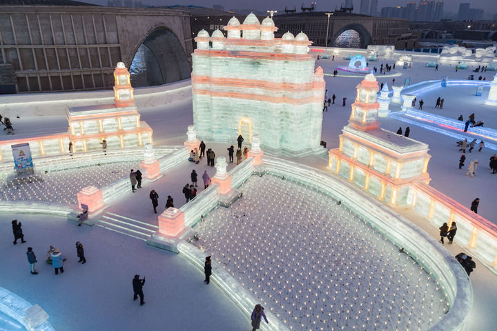 2023年2月1日,游客在哈爾濱冰雪大世界園區(qū)冰雪景觀《勝利之城》周邊游玩,該冰雪景觀以印度的法塔赫布爾西格里城為原型設(shè)計(jì)建造(無人機(jī)照片)。此屆哈爾濱冰雪大世界將上合組織成員國(guó)的特色建筑以冰雪景觀的形式呈現(xiàn)。新華社記者 謝劍飛 攝