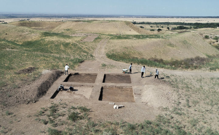 2023年8月9日,考古人員在中哈聯(lián)合考古項(xiàng)目拉哈特遺址探方上工作(無人機(jī)照片)。新華社發(fā)(奧斯帕諾夫攝)