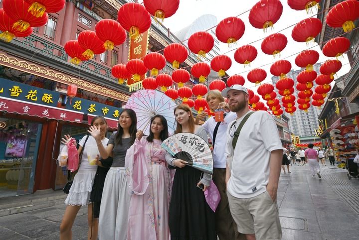2025年8月14日,上合國(guó)家學(xué)生在天津古文化街留影。新華社記者 李然 攝