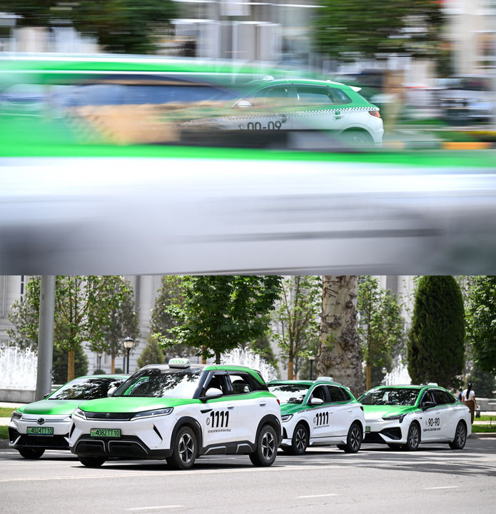 在塔吉克斯坦首都杜尚別,中國(guó)新能源汽車行駛在道路上(拼版照片,上圖攝于2025年5月28日,下圖攝于2025年5月29日)。新華社記者 李任滋 攝