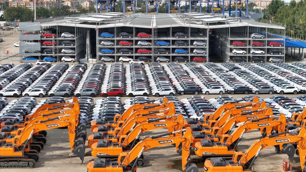 △山東港口煙臺港,國產汽車和工程機械集結等待裝船出口。