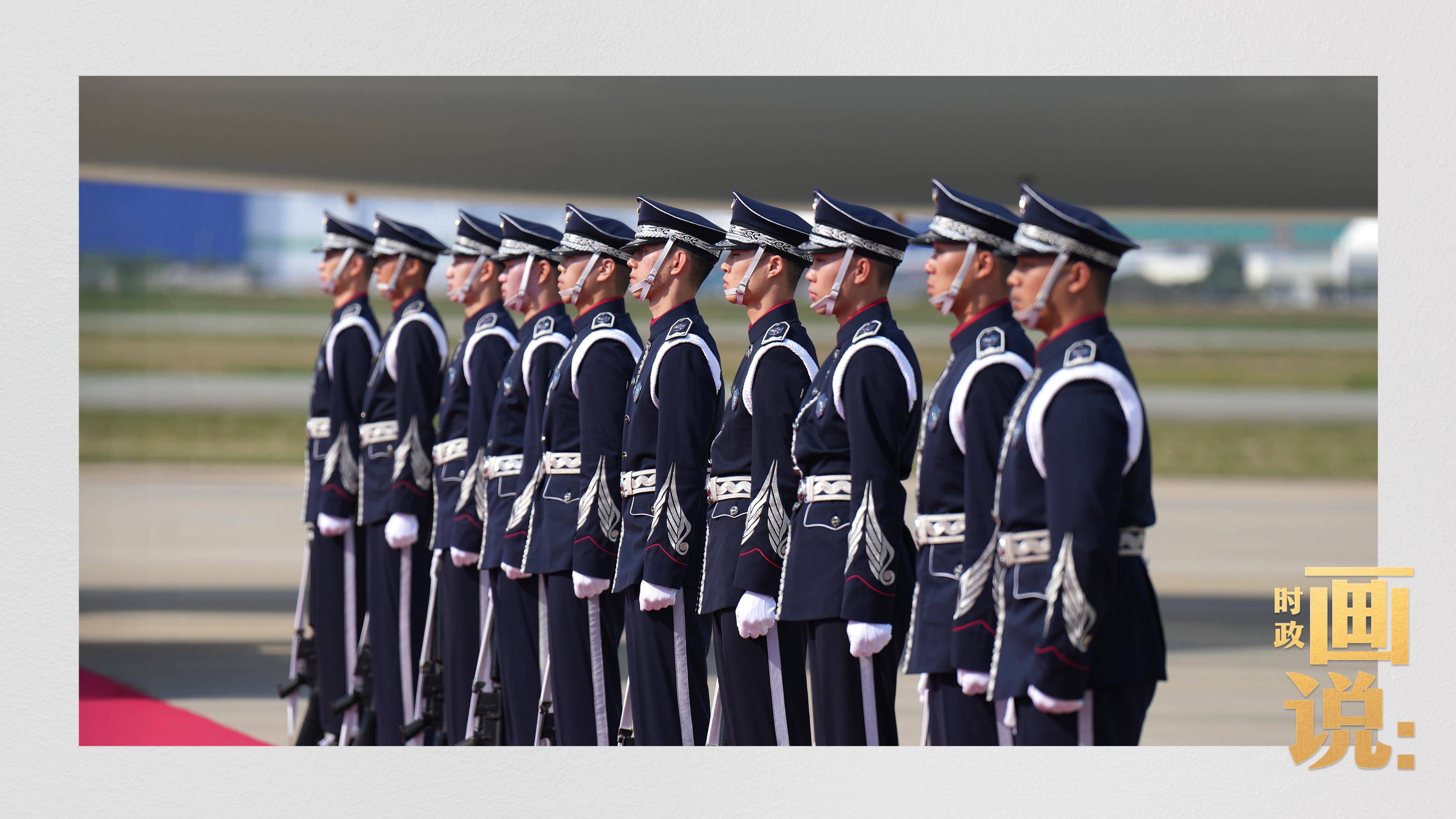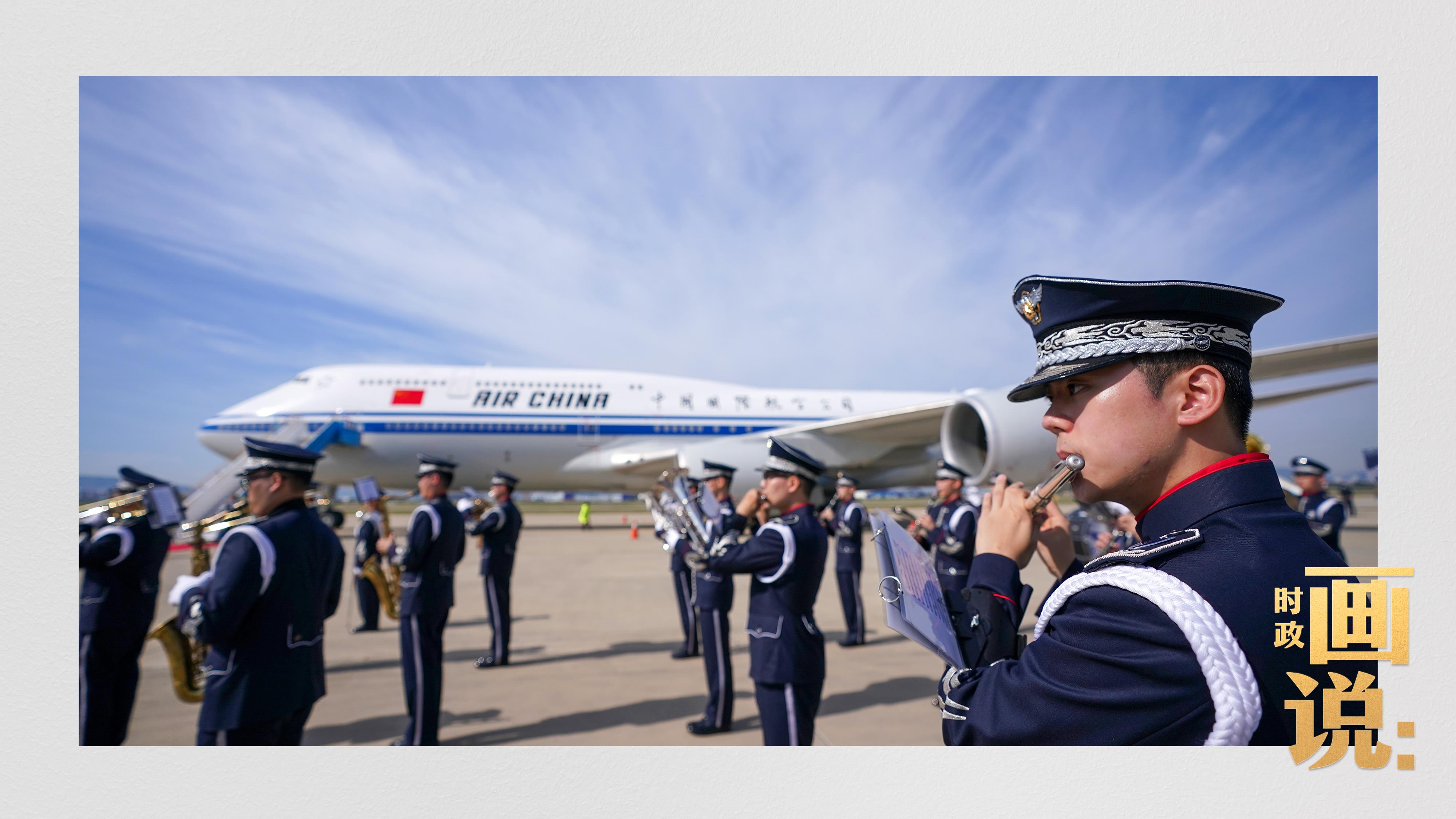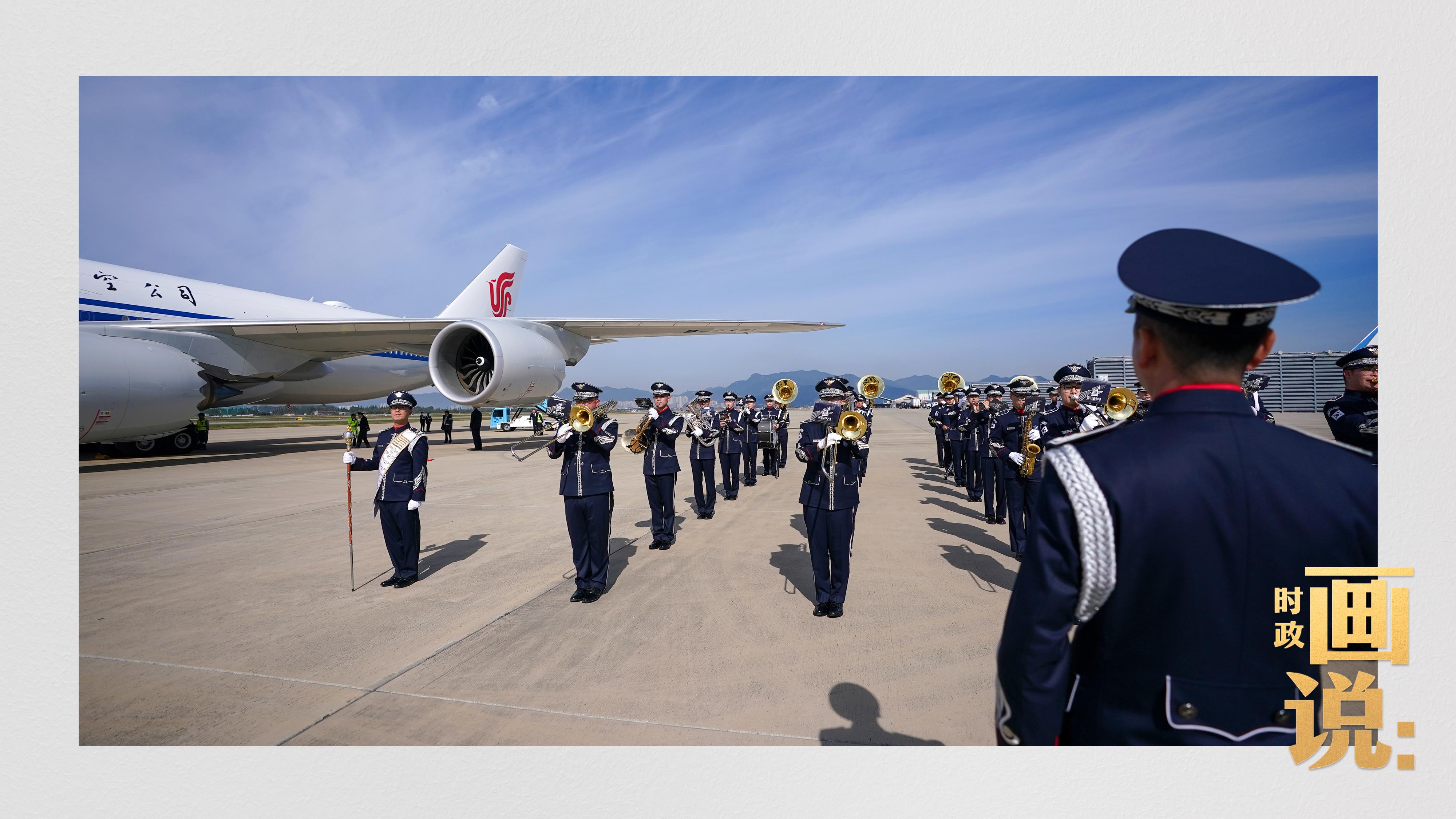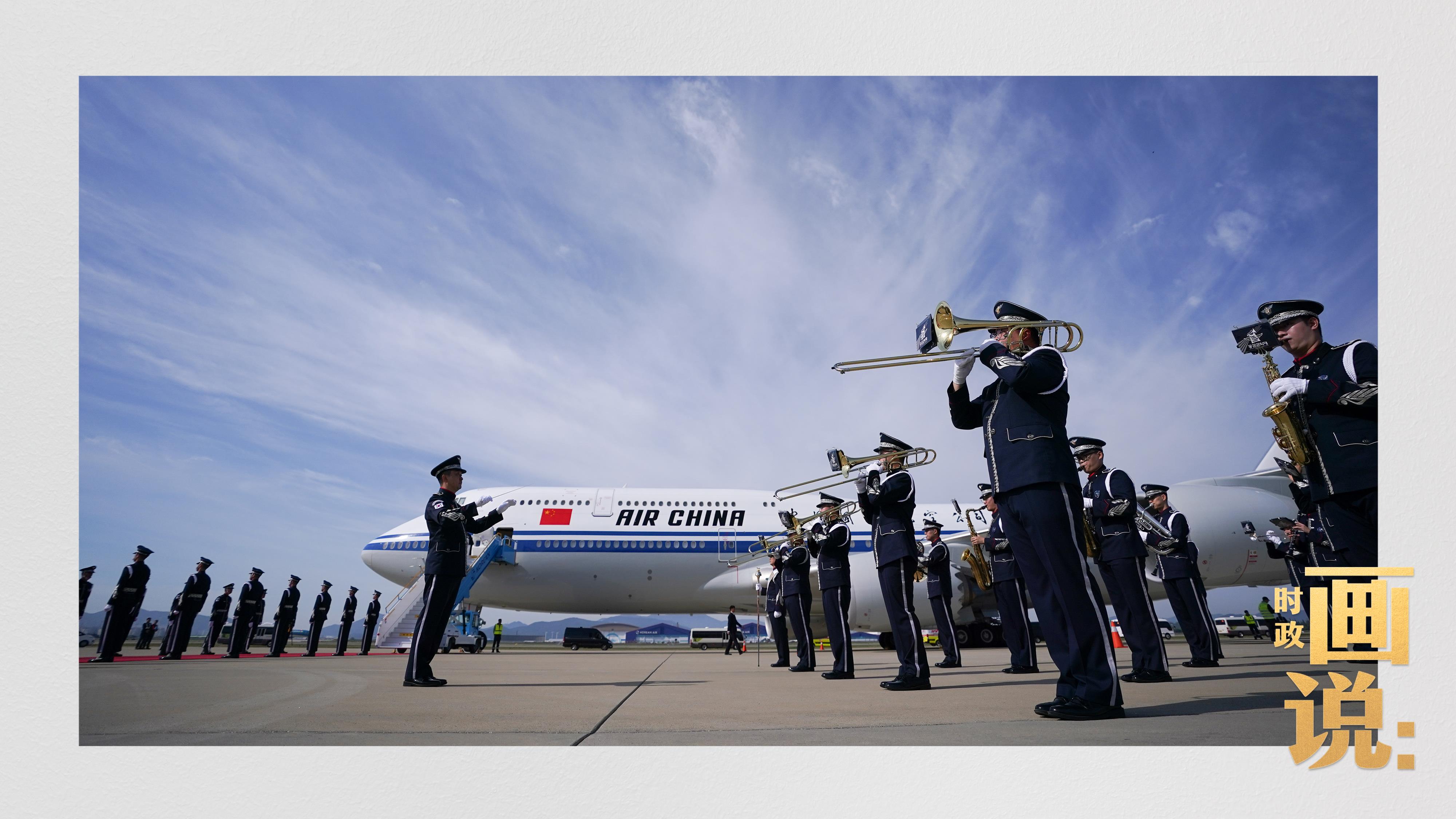 習(xí)近平抵達釜山金海國際機場時,韓國外長趙顯等高級官員熱情迎接。禮兵分列紅地毯兩側(cè)致敬,軍樂團演奏行進樂,機場鳴放21響禮炮。