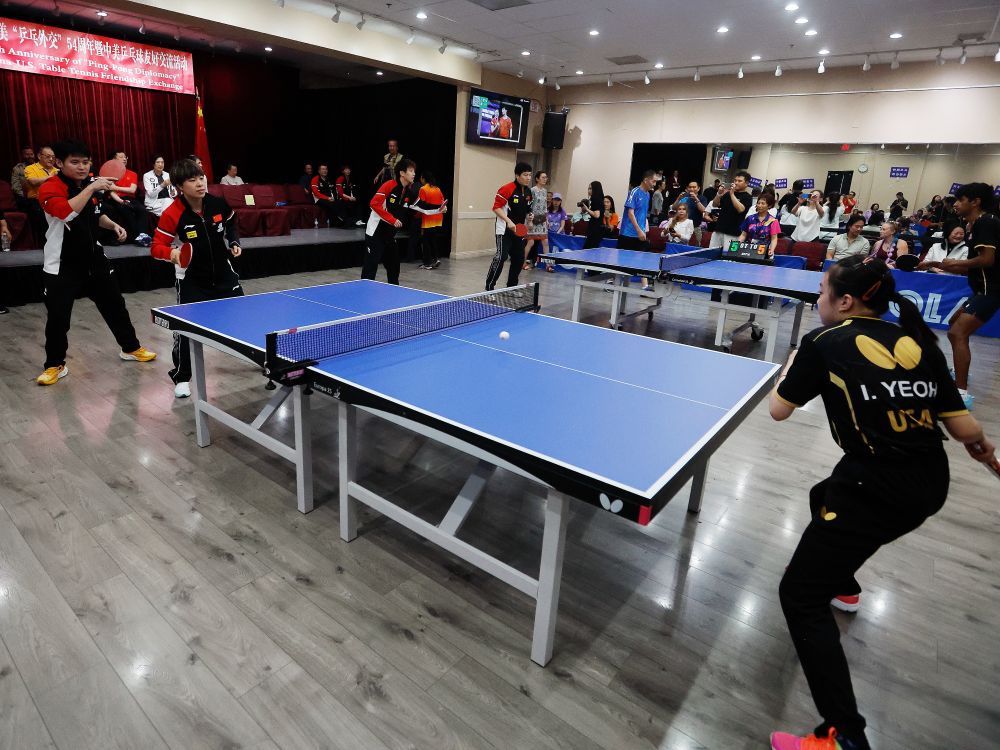 這是7月13日在美國內華達州拉斯維加斯拍攝的紀念中美“乒乓外交”54周年暨中美乒乓球友好交流活動現場。新華社發(fā)(邱晨攝)