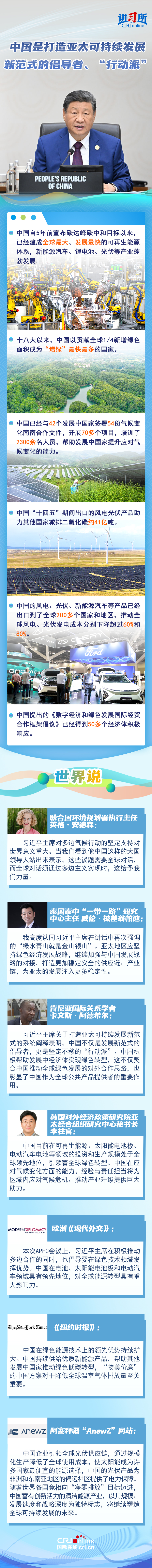 國際社會(huì)認(rèn)為,中國不僅是打造亞太可持續(xù)發(fā)展新范式的倡導(dǎo)者,更是堅(jiān)定不移的“行動(dòng)派”,亞太地區(qū)應(yīng)堅(jiān)持綠色經(jīng)濟(jì)發(fā)展戰(zhàn)略,繼續(xù)加強(qiáng)與中國發(fā)展戰(zhàn)略的對(duì)接,打造更加穩(wěn)定安全的供應(yīng)鏈、產(chǎn)業(yè)鏈,為亞太的發(fā)展注入更多穩(wěn)定性。