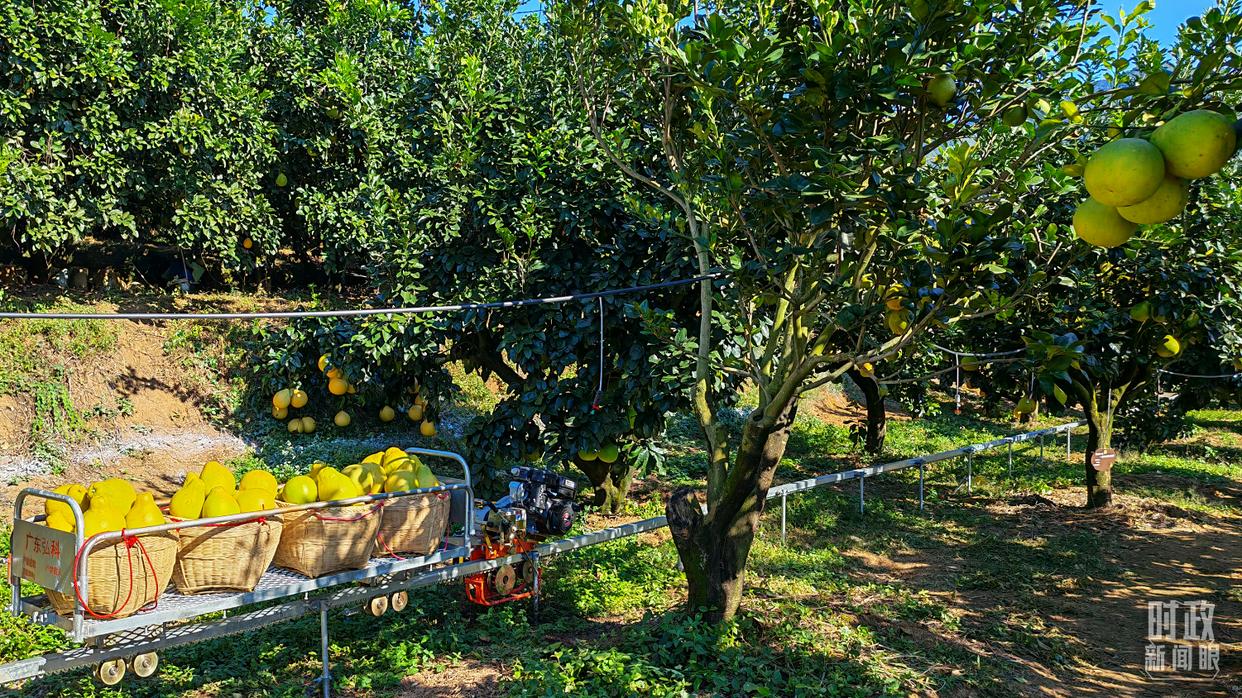 △金柚采摘運送用上了無人軌道車,可大大減輕人力負(fù)擔(dān)。(總臺央視記者郭鴻拍攝)