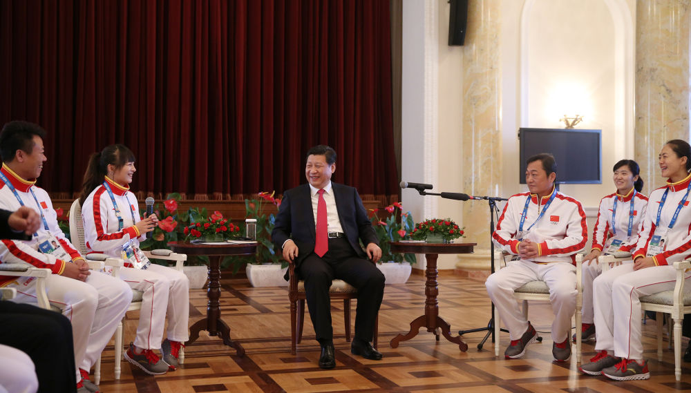 2014年2月7日,中共中央總書記、國家主席、中央軍委主席習(xí)近平在俄羅斯索契親切看望參加第二十二屆冬季奧林匹克運動會的中國體育代表團。這是習(xí)近平在座談會上與代表團成員親切交流。新華社記者 蘭紅光 攝