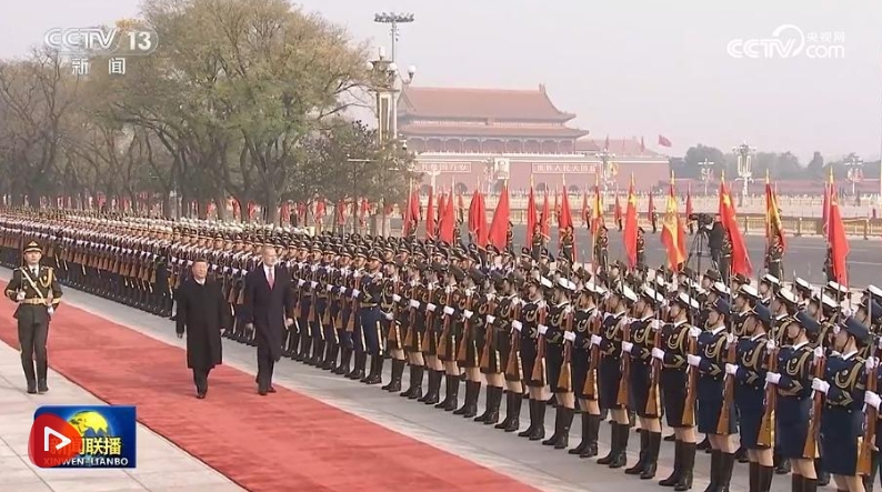 費(fèi)利佩六世抵達(dá)時(shí),禮兵列隊(duì)致敬。習(xí)近平同費(fèi)利佩六世登上檢閱臺,軍樂團(tuán)奏中西兩國國歌,天安門廣場鳴放禮炮21響。費(fèi)利佩六世在習(xí)近平陪同下檢閱中國人民解放軍儀仗隊(duì),并觀看分列式。