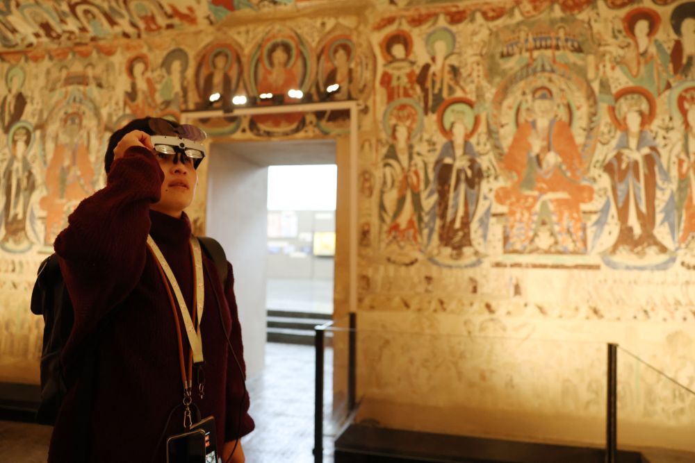 2025年10月30日,在敦煌石窟文物保護(hù)研究陳列中心,游客使用AR設(shè)備在復(fù)制洞窟參觀體驗(yàn)。