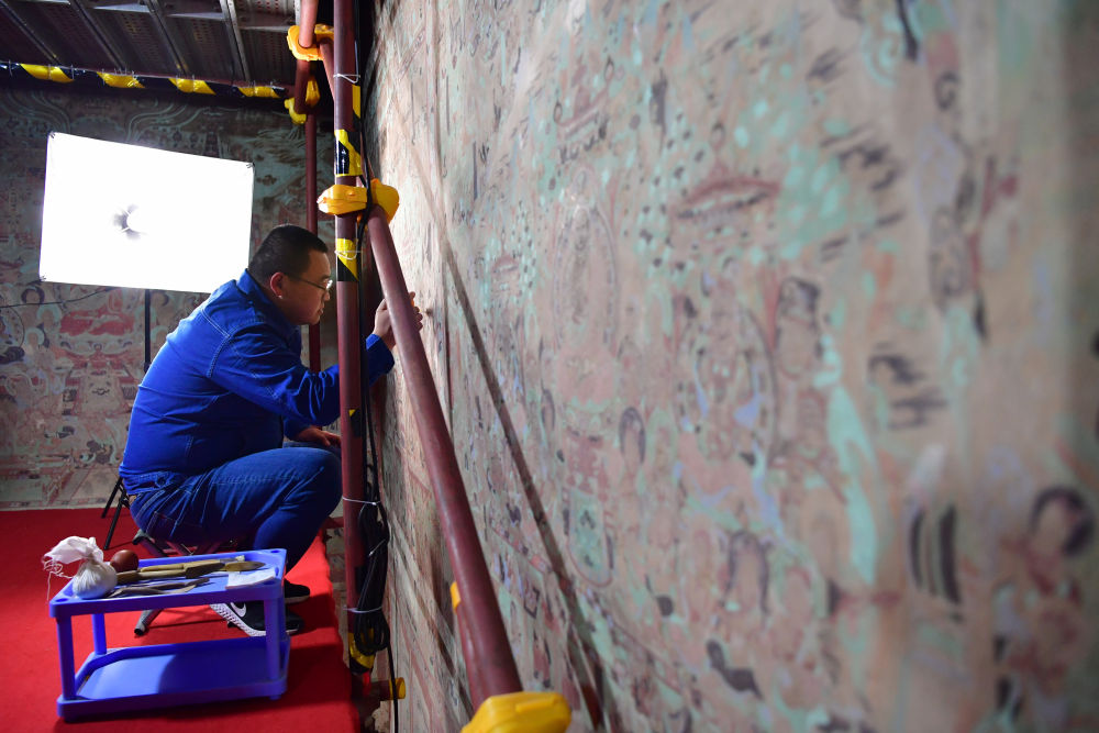 2023年4月25日,敦煌研究院文物數(shù)字化保護(hù)團(tuán)隊(duì)圖像采集人員熊業(yè)騰在洞窟內(nèi)調(diào)試設(shè)備,準(zhǔn)備采集壁畫圖像。30多年前,敦煌研究院便嘗試以數(shù)字技術(shù)讓古老石窟“芳華永駐”。2016年,“數(shù)字敦煌”資源庫上線,首次向全球免費(fèi)共享30個(gè)敦煌石窟的高清圖像和全景漫游,用戶足不出戶就能欣賞到高清的敦煌文化數(shù)字資源,目前訪問用戶遍布全球78個(gè)國(guó)家,累計(jì)訪問量超過2000萬次。