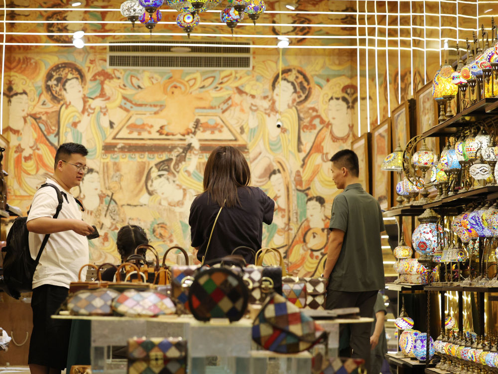 2025年6月26日,游客在敦煌夜市選購文創(chuàng)產(chǎn)品。今年以來,敦煌市全面改造敦煌夜市等特色街區(qū),圍繞敦煌深厚的歷史文化底蘊(yùn),融入壁畫、絲路文化等元素,通過布設(shè)文化景觀小品、打造沉浸式餐飲體驗(yàn)空間、上線特色文創(chuàng)產(chǎn)品等方式,給游客帶來多元體驗(yàn),“夜經(jīng)濟(jì)”持續(xù)升溫,不斷釋放文旅消費(fèi)潛力。