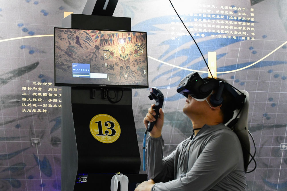 2024年7月22日,一名游客在敦煌莫高窟“尋境敦煌——數(shù)字敦煌沉浸展”上借助VR設(shè)備沉浸式游覽莫高窟第285窟虛擬場(chǎng)景?!皩ぞ扯鼗汀本C合運(yùn)用了VR虛擬現(xiàn)實(shí)、三維建模、游戲引擎的物理渲染和全局動(dòng)態(tài)光照等新技術(shù),高精度立體還原了莫高窟第285窟。游客戴上VR眼鏡,不僅可以零距離觀賞壁畫、360度自由探索洞窟細(xì)節(jié),還能“飛升”到窟頂,身臨其境參與壁畫故事情節(jié),沉浸式感受敦煌文化的魅力。