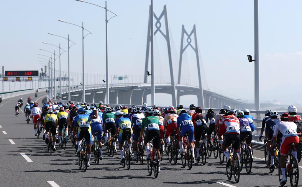 11月8日,參賽選手在港珠澳大橋騎行。當(dāng)日進行的第十五屆全國運動會公路自行車男子個人賽,賽道全程231.8公里,選手經(jīng)過港珠澳大橋,跨越粵港澳三地。圖源:新華社
