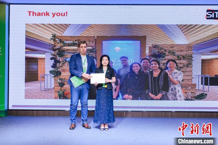圖為福州大學(xué)生物科學(xué)與工程學(xué)院院長(zhǎng)汪少蕓教授為參會(huì)外籍學(xué)者頒發(fā)演講證書。福州大學(xué)供圖