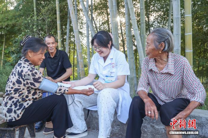 一邊拉家常一邊量血壓,溫暖的陽光透過竹林的間隙灑下來,竹葉在風(fēng)中簌簌搖曳,吳靜怡和村民的談笑聲,伴隨著此起彼伏的蟬鳴,共同組成了一曲交響樂,在寂靜的鄉(xiāng)村中傳得很遠(yuǎn)。