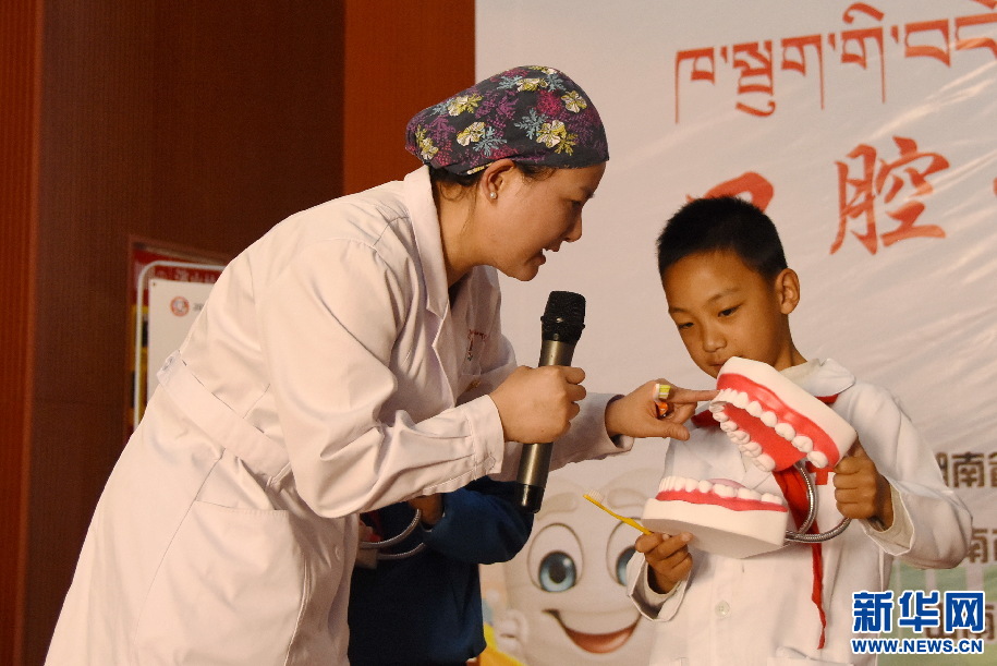 湖南援藏醫(yī)生李毅萍在講解口腔衛(wèi)生知識(9月18日攝)。新華網(wǎng) 張宸攝