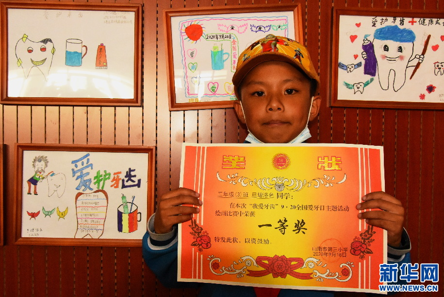 三年級學(xué)生旦增洛色所作的繪畫“愛護牙齒”得了一等獎,現(xiàn)場拿到獎狀的他很是興奮?!笆迨灏⒁虃兘o我們講了很多愛護牙齒的知識,還叮囑我們要養(yǎng)成刷牙的好習(xí)慣?!钡┰雎迳f,“我會把了解到的這方面知識,告訴身邊所有人,讓他們也都有健康的牙齒?!?/p>
