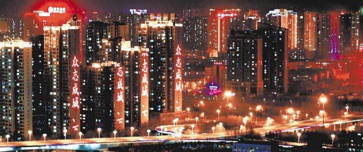 2020年2月8日晚,西寧部分樓體亮起了“眾志成城,抗擊疫情,人人有責”等抗擊疫情的字幕。記者 祁國彪 攝