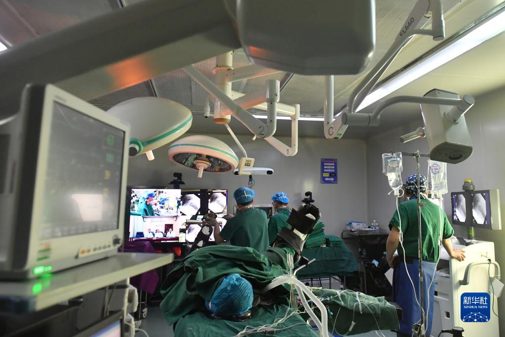 拉薩市人民醫(yī)院骨科醫(yī)生在北京積水潭醫(yī)院專家遠程指導(dǎo)下使用骨科機器人開展骨科手術(shù)(2021年4月19日攝)。新華社記者 孫瑞博 攝