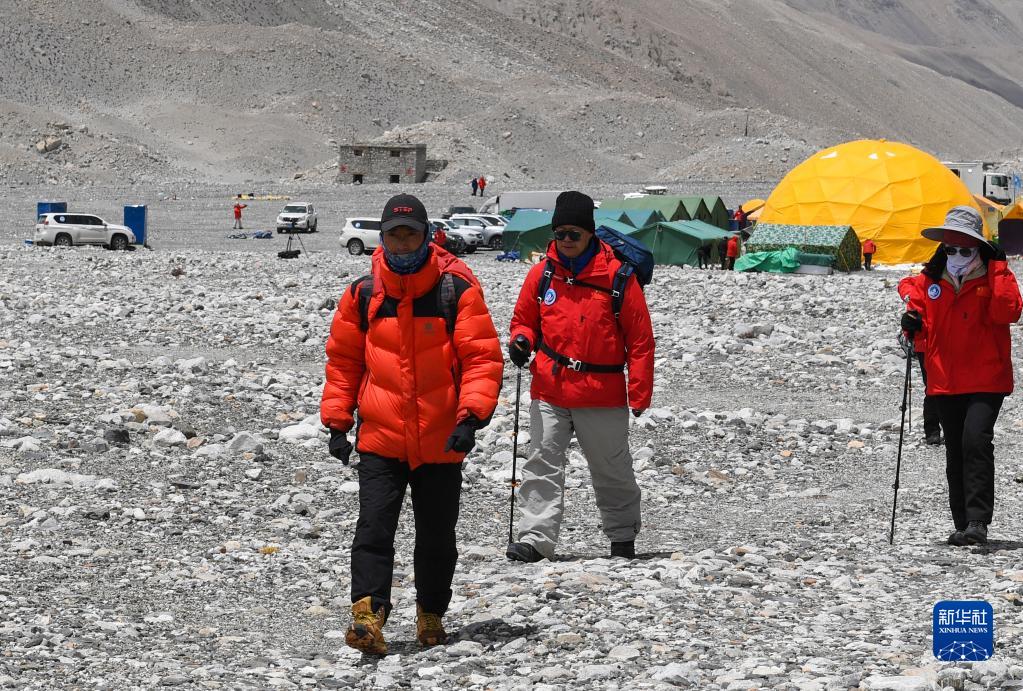 朱彤(右)和科研人員在珠峰登山大本營和絨布冰川間徒步穿梭(5月1日攝)。新華社記者 姜帆 攝