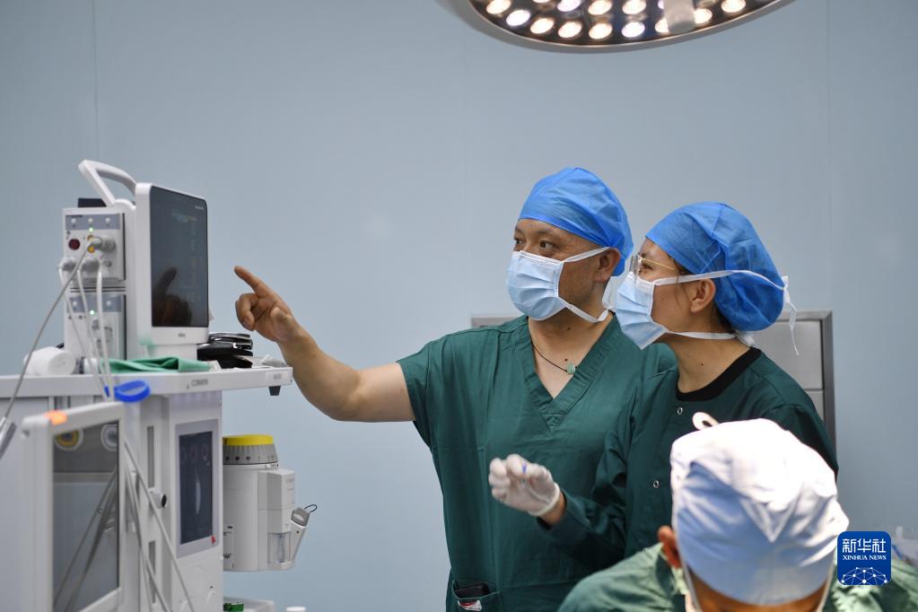 7月31日,在阿里地區(qū)人民醫(yī)院手術(shù)室,西藏自治區(qū)人民醫(yī)院麻醉科醫(yī)生達(dá)娃吾珠(左一)指導(dǎo)當(dāng)?shù)芈樽磲t(yī)生旦增次白進(jìn)行麻醉監(jiān)測。新華社記者 張汝鋒 攝