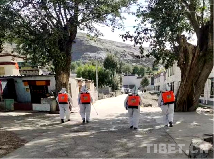圖為志愿服務(wù)隊志愿者們在拉隆村進行消毒工作