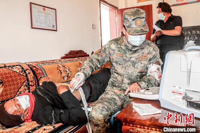 圖為醫(yī)療隊(duì)軍醫(yī)來到格桑措姆老人的家中為她檢查膝蓋疼痛問題?!≈煳男?攝