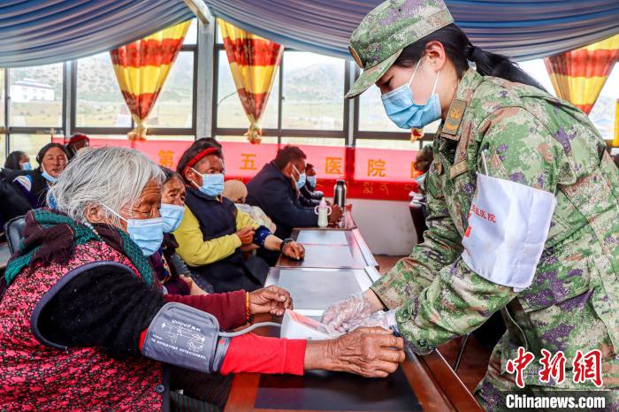 圖為醫(yī)療隊(duì)軍醫(yī)為村民測(cè)量血壓。 朱文秀 攝