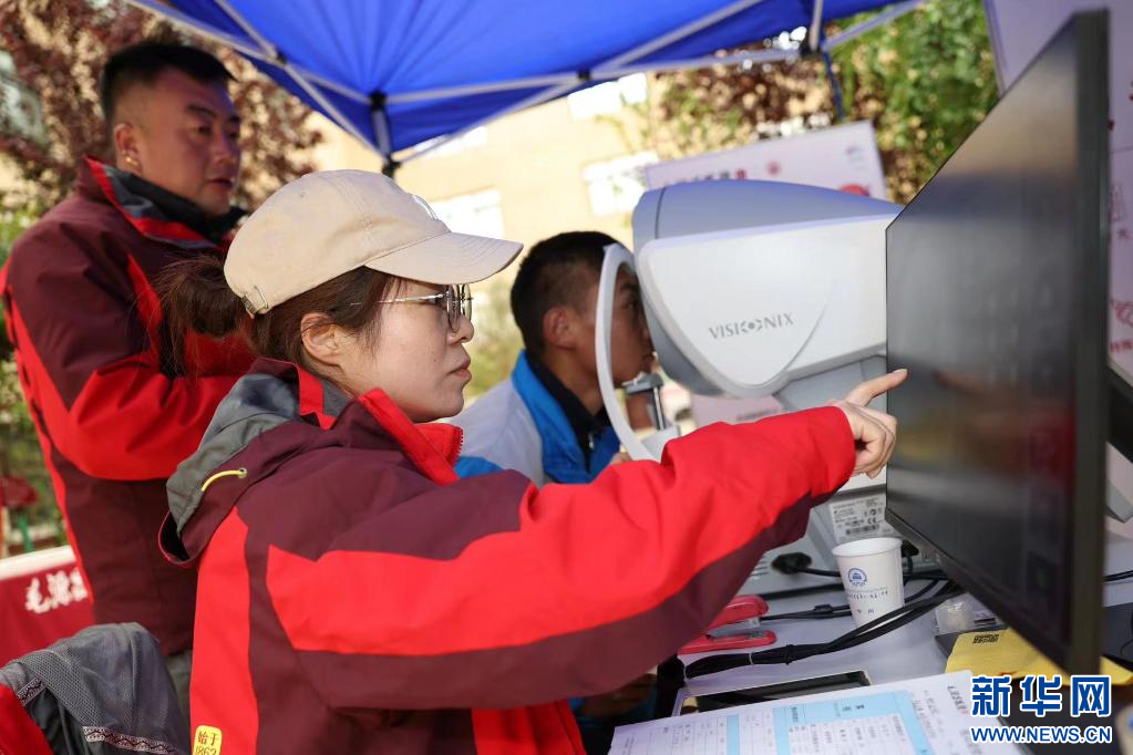 ?在西藏自治區(qū)那曲市色尼區(qū)第二中學(xué)(杭嘉中學(xué)),志愿者狄璐琬正引導(dǎo)戴上試戴架的學(xué)生適應(yīng)眼鏡清晰度(6月22日攝)。新華社發(fā)(趙穎碩 攝)