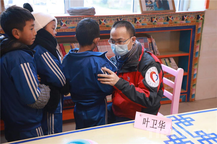 圖為解放軍總醫(yī)院心臟外科葉衛(wèi)華為當(dāng)?shù)貙W(xué)生聽診篩查
