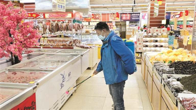 圖為超市工作人員對冷凍生鮮食品區(qū)進行消毒殺菌工作。記者 拉珍 攝