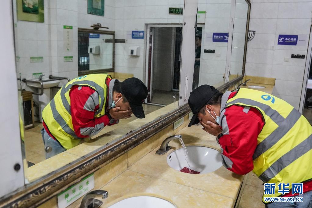 7月20日深夜,在河北保定服務區(qū)休息時,司機蘆艷會在衛(wèi)生間洗臉。新華社記者 彭子洋 攝