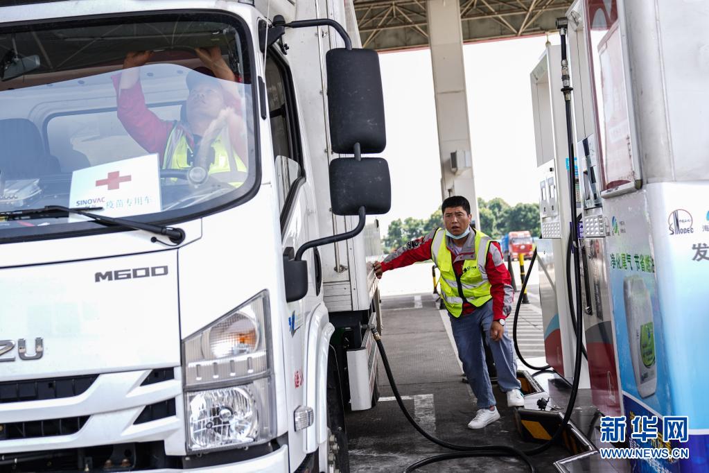7月22日,在運送疫苗途中,司機蘆艷會在加油站給車加油。新華社記者 彭子洋 攝