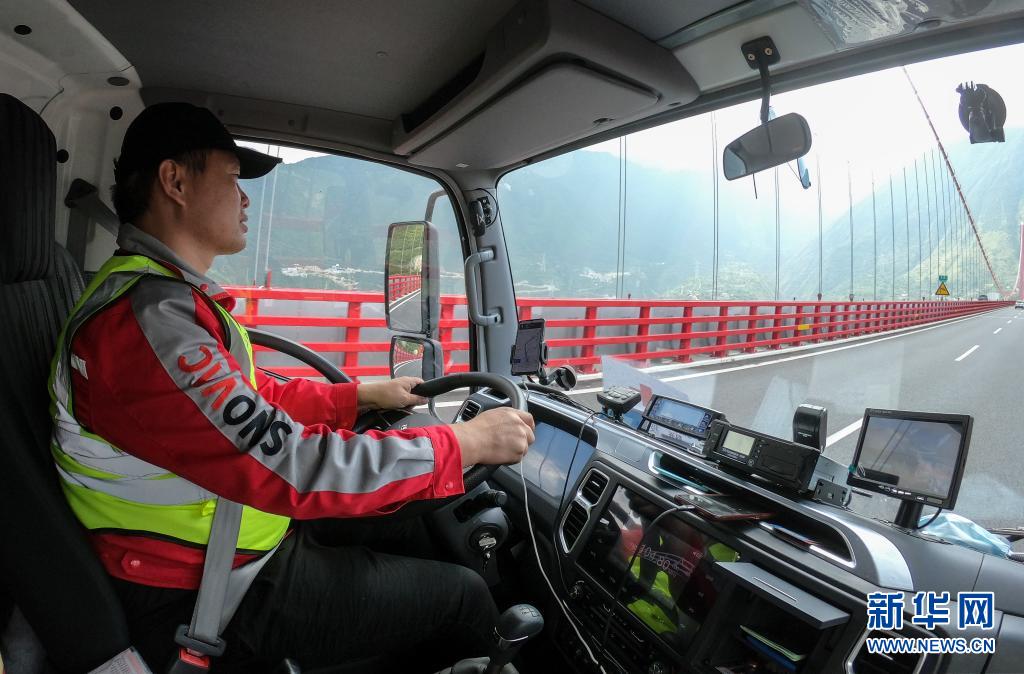 7月22日,司機劉思駕駛運送疫苗的冷鏈車經(jīng)過大渡河。新華社記者 彭子洋 攝