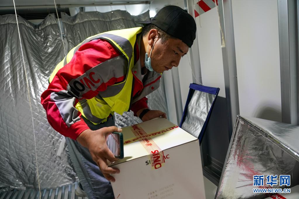 7月22日,蘆艷會在冷鏈車內將疫苗搬出,準備交付給四川甘孜州疾控中心。新華社記者 陳鐘昊 攝
