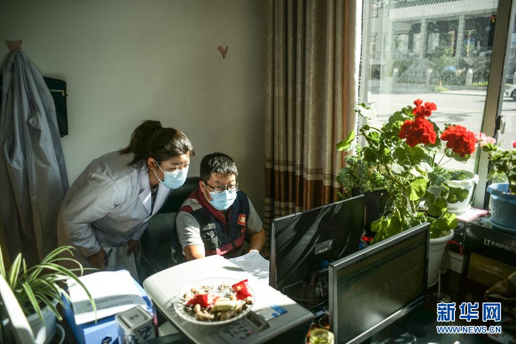 7月23日,四川甘孜州疾控中心工作人員黃亮(右)在稻城縣疾控中心與當?shù)毓ぷ魅藛T對接疫苗信息。新華社記者 彭子洋 攝
