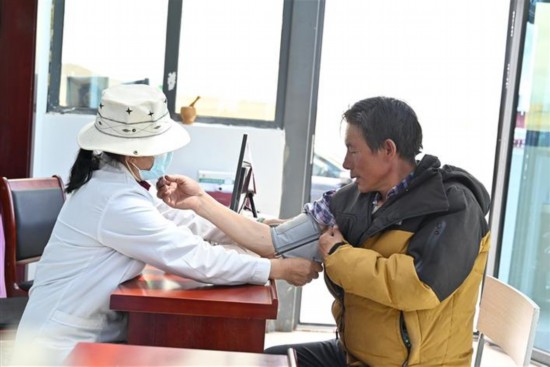 圖為那曲市聶榮縣色慶鄉(xiāng)衛(wèi)生院的醫(yī)生次仁吉在為色慶鄉(xiāng)19村牧民達(dá)加檢查身體。那曲采訪組 攝